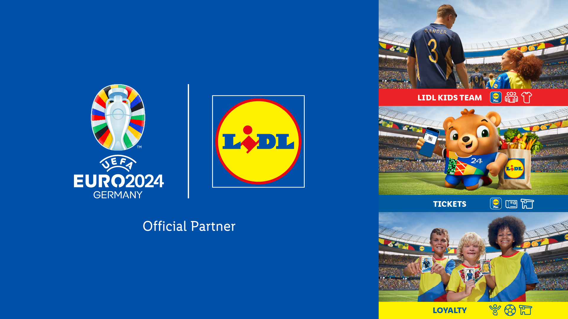 Με παρουσία σε 31 χώρες, η Lidl ήταν Official Partner του UEFA EURO 2024TM και των European Qualifiers, από τον Μάρτιο 2023 έως και τον Ιούλιο 2024. Με κεντρικό μήνυμα “We’re on your team”, υπογραμμίστηκε πανευρωπαϊκά η δέσμευσή της να βρίσκεται δίπλα στις «πραγματικές» ομάδες, αυτές των καθημερινών ανθρώπων, καλύπτοντας κάθε τους ανάγκη -με υψηλή ποιότητα προϊόντων σε προσιτές τιμές- και φέρνοντάς τους ένα βήμα πιο κοντά στη διοργάνωση. Η διεθνής καμπάνια, με κοινά σημεία αναφοράς μεταξύ των χωρών, ανέδειξε τη Lidl ως το πιο αναγνωρισμένο brand ανάμεσα στους χορηγούς στη Γερμανία, προωθώντας τον αθλητισμό και την ισορροπημένη διατροφή.